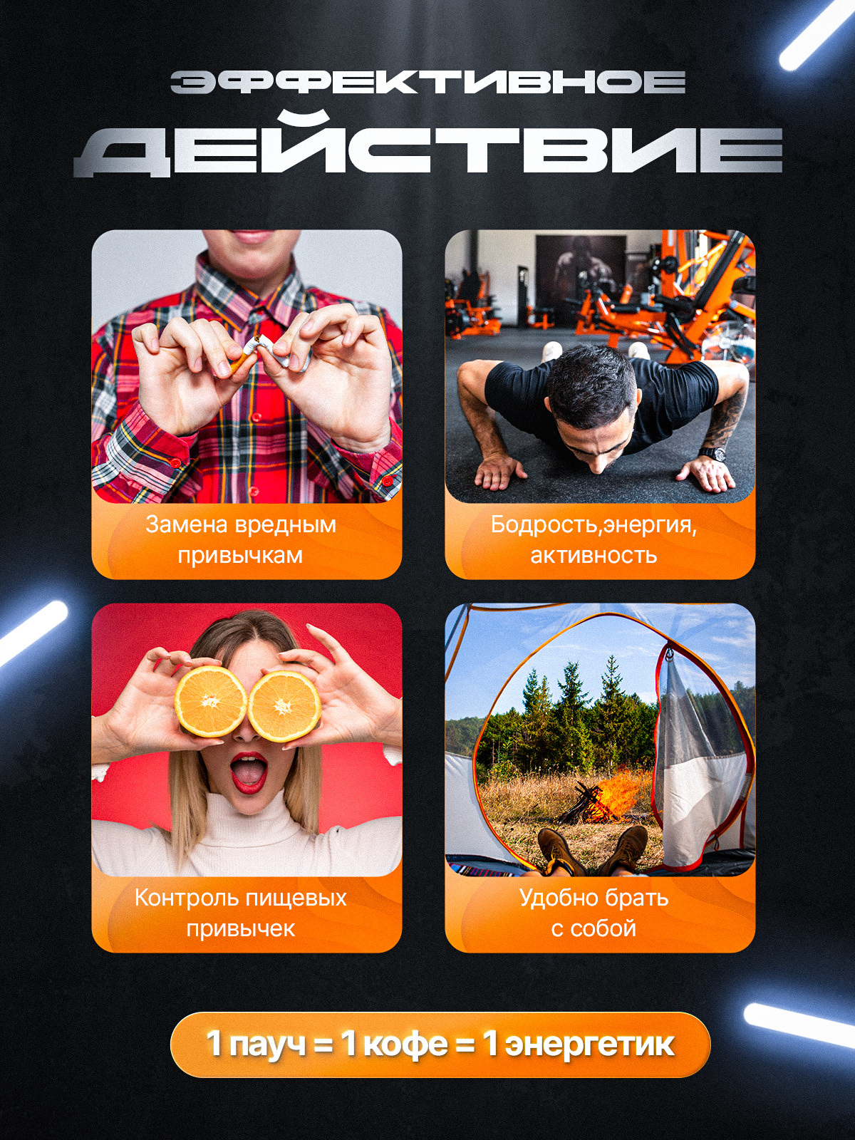 Мощная энергия без вреда – 200 мг натурального кофеина в каждом пауче для высокой концентрации и продуктивности.